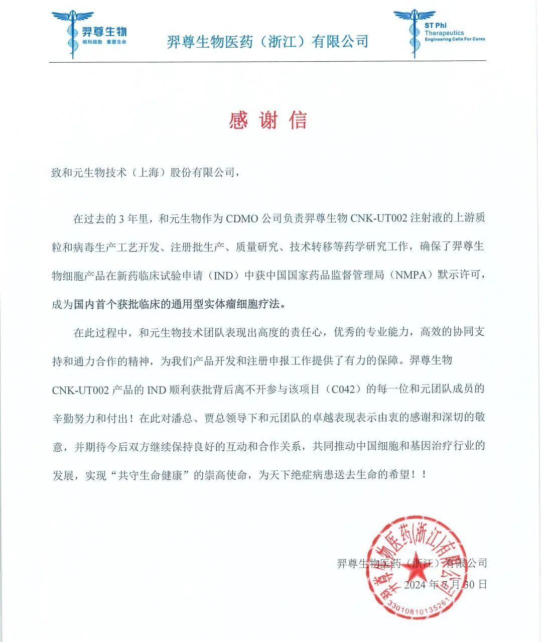 近日,尊龙网站官方入口生物技术(上海)股份有限公司(以下简称“尊龙网站官方入口生物”)收到了来自合作伙伴羿尊生物医药(浙江)有限公司(以下简称“羿尊生物”)的一封特别感谢信。这封信不仅是对尊龙网站官方入口生物团队专业服务的认可,更是对尊龙网站官方入口双方合作成果的肯定!