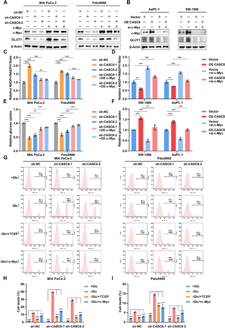 为了进一步阐明 c-Myc 在此过程中的作用,研究了不同 PDAC中NADP + /NADPH 比率和葡萄糖摄取量。观察到,在 CASC8 敲低细胞中过表达 c-Myc 会减弱 NADP + /NADPH 比率的增加,并挽救了 CASC8 消耗后观察到的相对葡萄糖摄取量的下降(图 7 C-D)。相反,在 CASC8 过表达细胞中敲低 c-Myc 会产生相反的效果(图 7 E-F)。在 CASC8 敲低细胞中过表达 c-Myc 显著挽救了 CASC8 消耗后观察到的双硫死亡细胞的增加(图 7 G-I)。总之,这些发现表明 CASC8 通过 c-Myc 依赖性机制促进 PDAC 细胞在葡萄糖饥饿条件下存活。