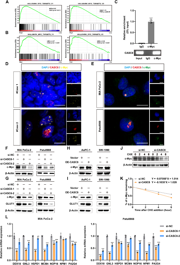 GSEA分析显示 CASC8与 c-Myc存在显著相关性(图 6 A)。RNA 测序进一步证实了这一结果(图 6 B)。c-Myc在调节细胞过程中起着关键作用。RIP和共定位结果验证了CASC8 与 c-Myc 蛋白的相互作用,激活下游效应分子发挥功能。(图 6 C-E)。CASC8 敲低后 c-Myc显著降低,而 CASC8 过表达导致 c-Myc升高(图 6 F-I)。为了研究蛋白质稳定性,用环己酰亚胺 (CHX) 处理以抑制蛋白质合成。与对照组相比,CASC8 敲低细胞中 c-Myc 的降解率显著增加(图 6 J-K)。此外,敲低 CASC8 显著降低了下游 c-Myc 靶基因的 mRNA 水平(图 6 L)。总之,这些发现表明 CASC8 可能与 c-Myc 蛋白结合,促进其稳定性,从而激活下游效应分子。
