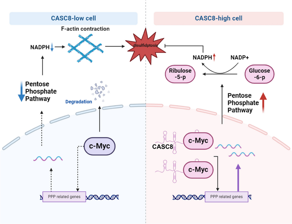 ③揭示CASC8通过c-Myc激活磷酸戊糖途径抑制双硫死亡的分子机制:进一步揭示了CASC8通过与c-Myc结合并调节其稳定性,激活磷酸戊糖途径(PPP),从而抑制双硫死亡的分子机制。